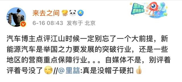 微博CEO@来去之间回应称:汽车博主点评江山的时候,一定别忘了一个大前提,新能源汽车是举国之力要发展的突破行业,还是一些地区营商的重点保护行业,别评着评着号没了。并回复评论称:被封博主攻击新能源厂商和企业家。